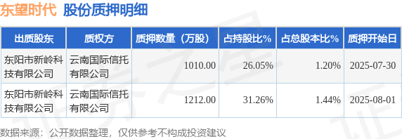 证券之星音信,东望时期(600052)8月14日公开信息披露,鼓吹东阳市新岭科技有限公司向云南外洋相信有限公司系数质押2222.0万股,占总股本2.64%。质押笃定见下表: