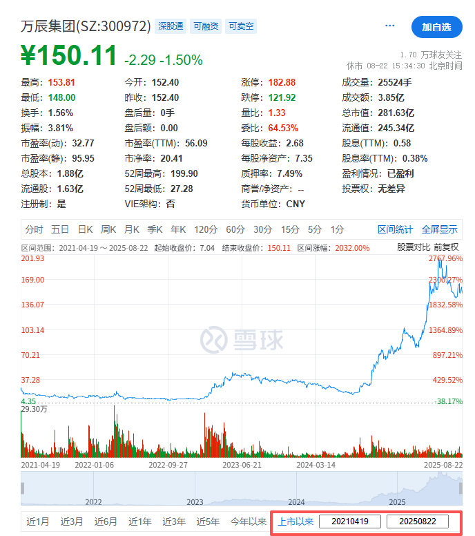 万辰集团(300972.SZ),于2021年4月在深交所上市,适度2025年8月22日收市,市值约281.63亿元东说念主民币。