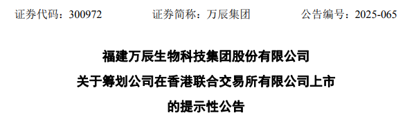 来自福建漳州漳浦县的A股上市公司万辰集团(300972.SZ)公告称,为进一步鼓舞公司海外化策略,进步公司品牌有名度和详细竞争力,完善公司供应链体系成就,经公司充分论证,公司盘算推算刊行H股股票并肯求在香港聚首交游悉数限公司主板挂牌上市。